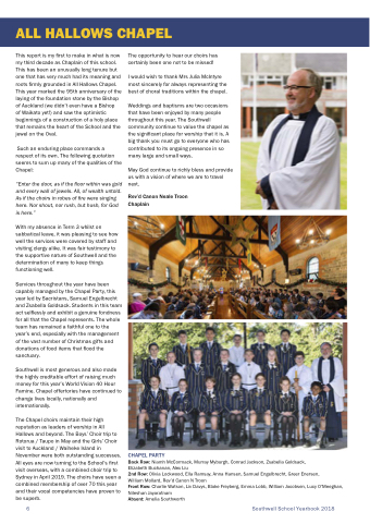 This report is my rst to make in what is now my third decade as Chaplain of this school. This has been an unusually long tenure but one that has very much had its meaning and roots rmly grounded in All Hallows Chapel. This year marked the 95th anniversary of the laying of the foundation stone by the Bishop of Auckland (we didn’t even have a Bishop